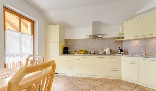 Wohnküche: Sitzecke mit Tisch, Kühlschrank mit Gefrierfach, Mikrowelle, 4er Elektrokeramikplatte, Abzugshaube, Geschirrspülmaschine, Wasserkocher, Kaffeemaschine, Spülbecken, Trockentücher, Geschirr, Vorratsraum, großer Balkon