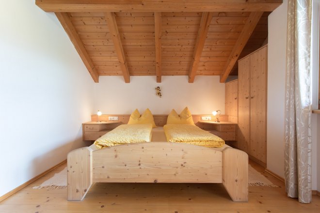 Schlafzimmer mit Doppelbett, in Fichte massiv eingerichtet, großzügige Schränke, Balkon mit Blick ins Überetsch und bis nach Meran